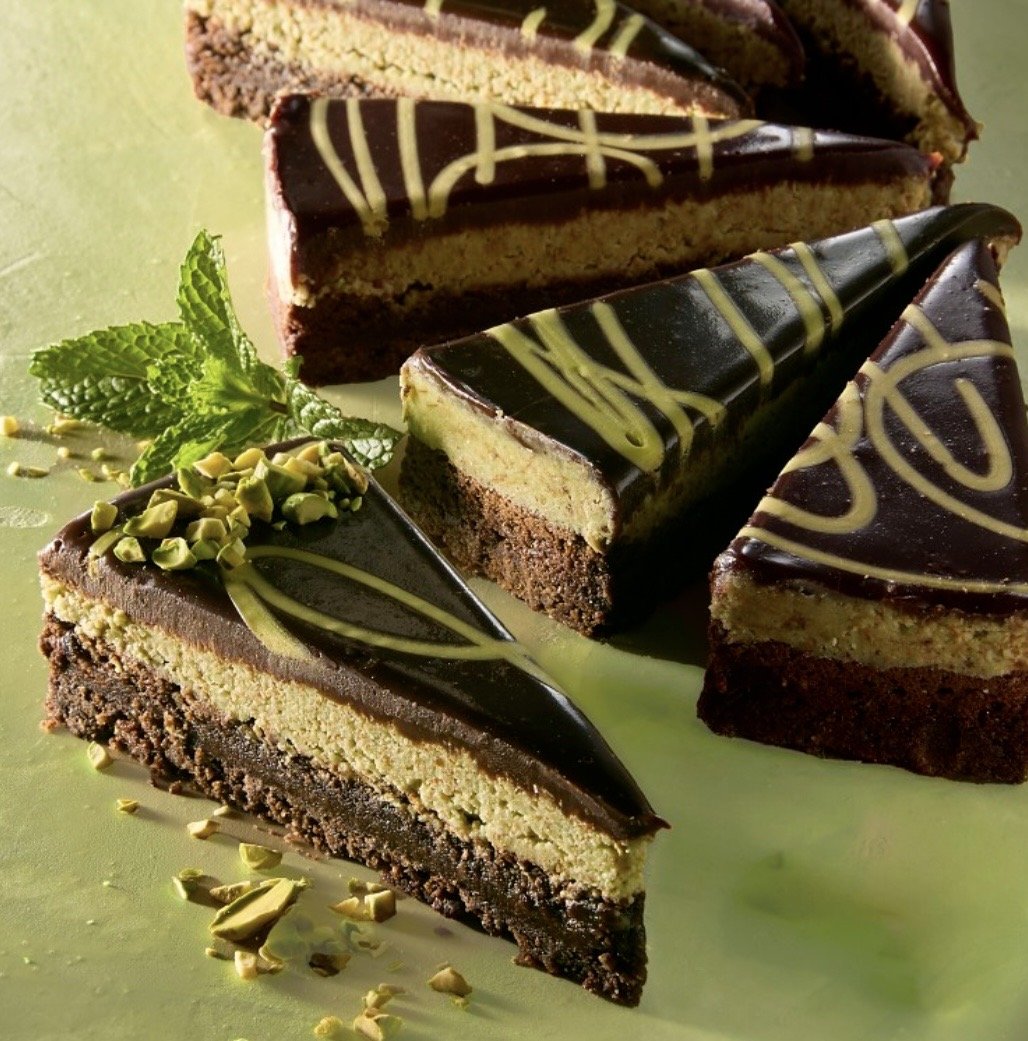 A chocolate graham crust base is topped with a luscious ganache and a crunchy layer of pistachio and kataifi, then topped with more velvety chocolate ganache – making it a perfect salty, crunchy, decadent bite.